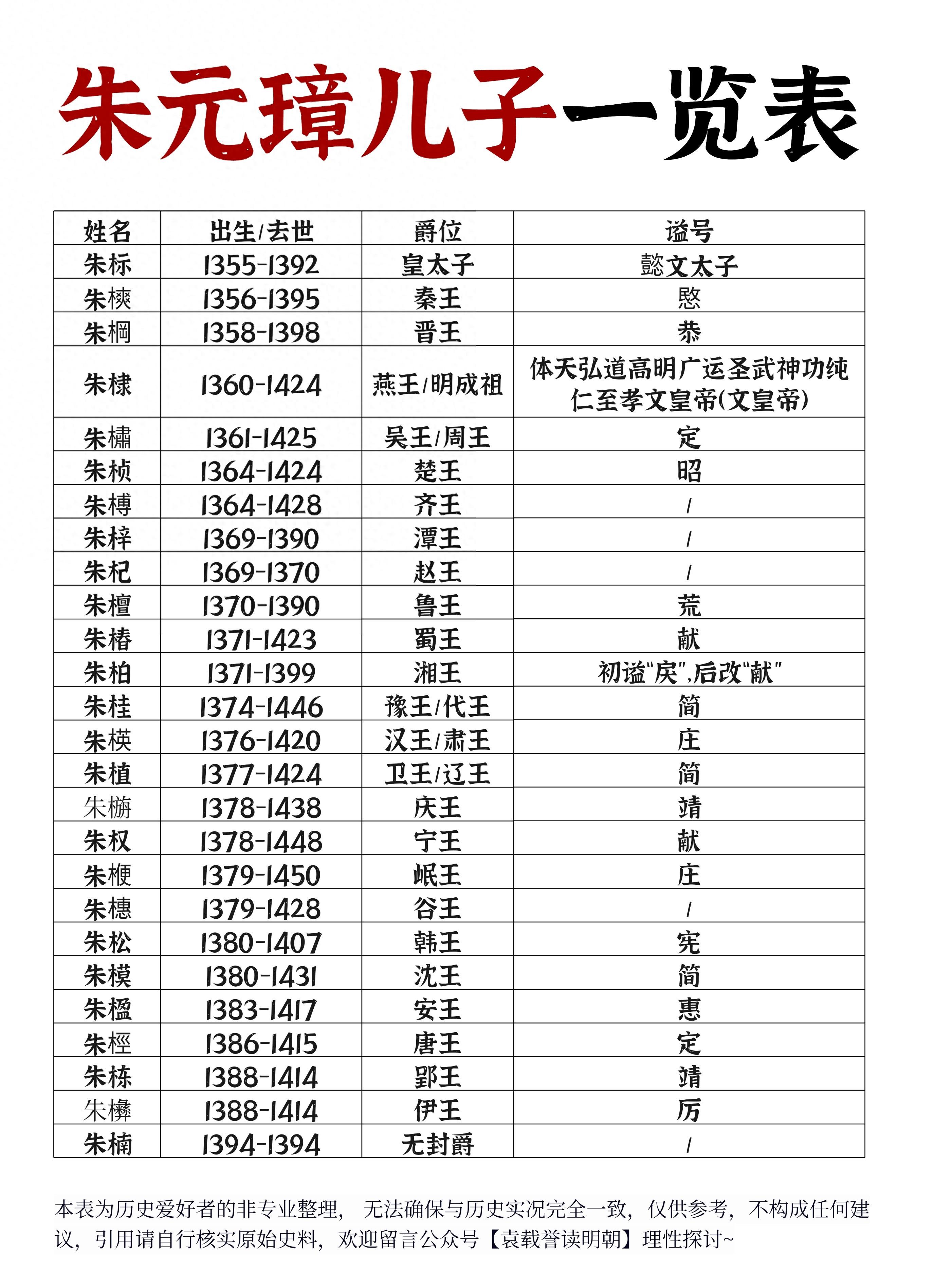 排序上来说,主要是依出生顺序排列,从1355年朱标诞生开始,到1394朱楠出生结束,朱元璋得子的跨度其实有约39年。