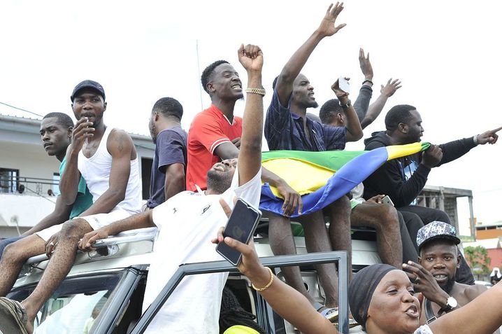 当地时间2023年8月30日,加蓬利伯维尔,一群军官出现在电视上,宣布他们“结束了现政权”,并废除了让总统邦戈再次连任的官方选举结果,居民们在庆祝。(视觉中国)