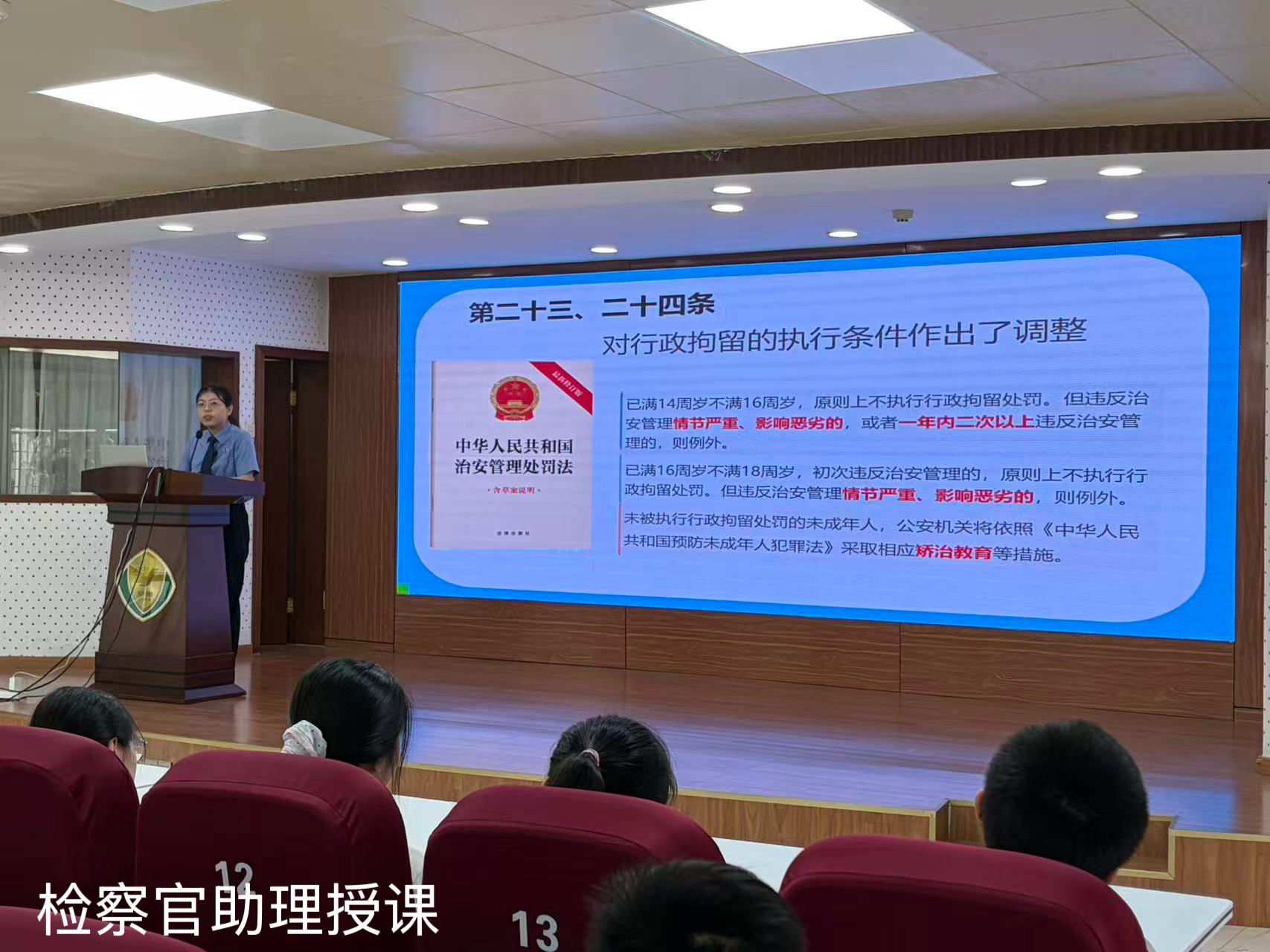 课堂上,来自广州市越秀区人民检察院的检察官助理黄丹,围绕2026年1月1日起正式施行的新修订《中华人民共和国治安管理处罚法》以及防范学生欺凌等内容展开讲解。她首先介绍了新法的施行时间与适用范围,重点说明了法律对未成年人违法行为处理方式的调整,特别是对行政拘留执行条件的相关规定。她指出,法律在体现教育为主、惩罚为辅原则的同时,对情节严重、影响恶劣或屡教不改的情形保留必要的法律制裁手段,并辅以矫治教育等措施,帮助行为偏差的未成年人回归正轨。